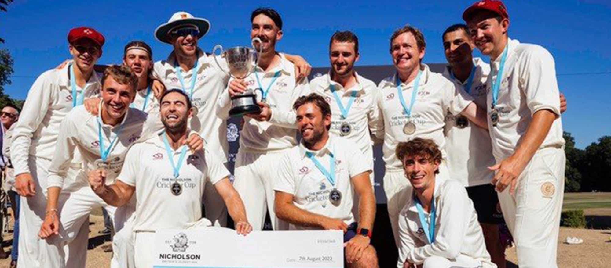 Bradfield only needed three bowlers with seamer Tom taking 6-37 in his 9.3 overs and Charlie’s slow left arm 4-33 in 7. Tom, who plays his cricket at Falkland in the Thames Valley league, moved the ball a little at a brisk medium pace and rightly claimed the Nicholson Man of the Match award for his startling figures, which have only been surpassed in two previous finals by Nick Wisdom’s 6-12 in the 1991 final for Charterhouse Friars, and Mark Hickson’s 6-27 in the 2000 final for Old Tonbridgians in what proved a losing cause. Having starred in the last-wicket partnership, wicket-keeper Sam took three catches to add to his valuable runs, and two smart slip catches by Imran and Hugo Darby (C 07-12).
